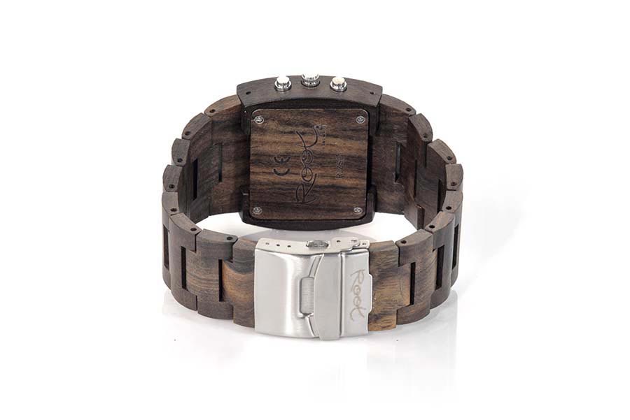 Reloj de madera fabricado en madera de de SANDALO NEGRO. La caja del Modelo RJZS01 está fabricada con madera de SANDALO NEGRO se trata de un modelo digital con varias funciones, hora, fecha, cronómetro etc. Correa de madera natural de sándalo negro con cierre de mariposa de acero inoxidable. Resistente a salpicaduras, ancho del reloj: 55mm
